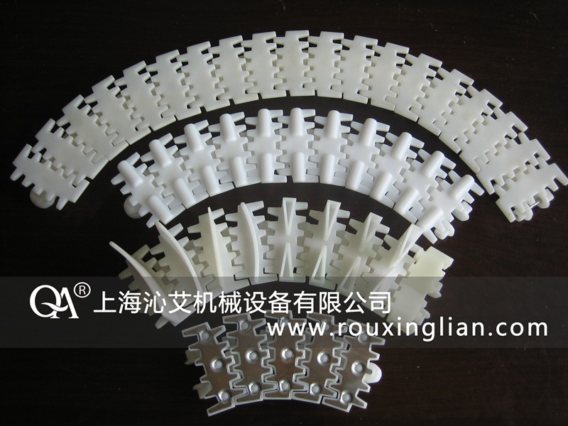 1、83齿形平板链、83弹性楔链、83平板链,板宽83mm,节距38mm。转弯半径150mm,1米≈26片,轴心不锈钢。
