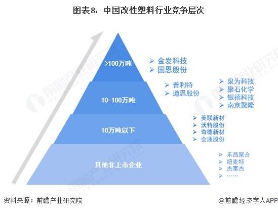 目前国内改性塑料的生产企业主要是金发科技、国恩股份、普利特、道思股份等企业。可以分为四个竞争层次——金发科技、国恩股份2024年产量在100万吨以上,处于第一梯队;普利特、道恩股份等产量在10-100万吨之间,处于第二梯队;美联新材、沃特股份、奇德新材产量不足10万吨,处于第三梯队,第四梯队为禾昌聚合、纽麦特、杰事杰等新三板企业及其他非上市企业。