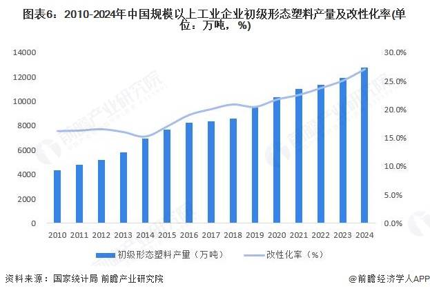 改性化率(改性塑料产量/塑料产量)是用来衡量改性塑料行业在塑料工业中地位的指标。根据国家统计局的统计数据显示,2010-2024年,我国规模以上工业企业初级形态塑料总产量从4361万吨上升至12752万吨,与此同时,根据中国塑料加工工业协会的统计数据,我国塑料改性化率也由2010年的16.2%增长到2024年的约27%。
