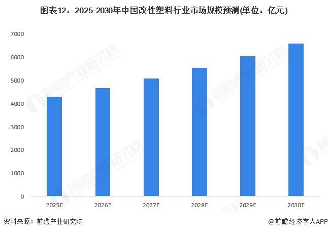 未来,改性塑料将向高性能化、环保化、多功能化方向发展,并逐渐渗透到更多应用领域。但改性塑料行业的生产环境不容乐观,国内改性塑料行业经过前期高速发展,目前行业出现产能过剩现状,同时国内经济增速放缓,国际贸易摩擦加剧,多个国家开展限塑禁塑令。然而近年来在新能源汽车带动下我国汽车产量增速明显,对应的改性塑料需求量也有所回升,未来对人口老龄化的预期也带来医疗器械设备行业对改性塑料需求的增长。综合来看,未来五年,国内改性塑料行业将继续发展,前瞻根据市场发展现状进行预测,保守估计2025-2030年我国改性塑料需求年均复合增速为9%,到2030年,我国改性塑料市场规模达到6596亿元。