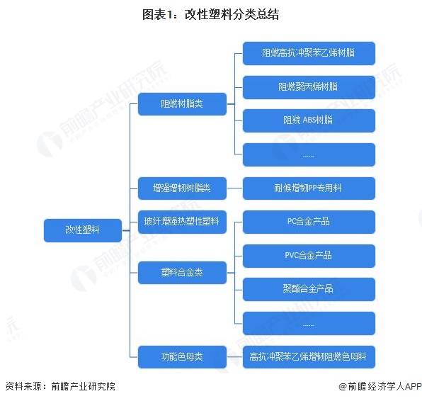 与原树脂材料相比,改性塑料在电、磁、耐热、阻燃、耐老化、机械性能等方面具有更加优越的性能。按照其功能应用进行划分,改性塑料主要可分为阻燃树脂类、增强增韧树脂类、玻纤增强热塑性塑料、塑料合金类和PVC合金产品等。